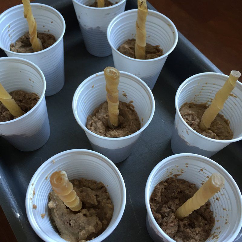 - Fyld engangskrusene halvt op med dåsemad og sæt en tyggepind i midten som håndtag. Sæt isene i fryseren i nogle timer eller natten over.