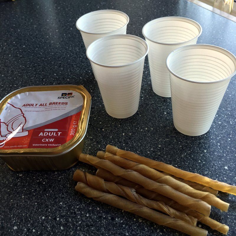 - Tag en dåse hundemad af god kvalitet, nogle engangskrus og en håndfuld tyggepinde